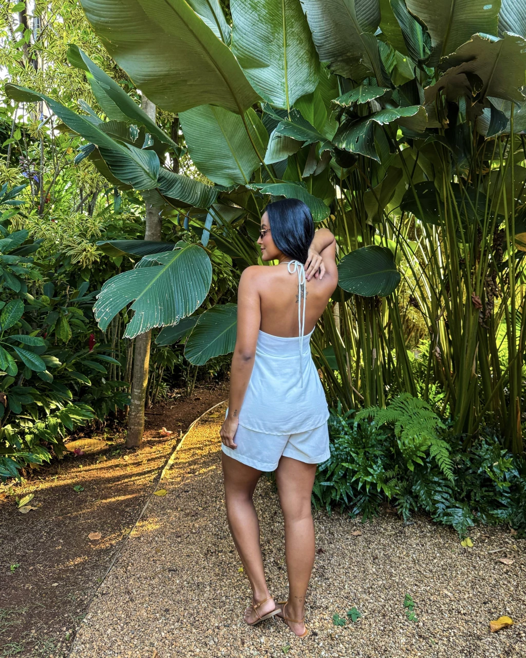 Composto por um short leve e uma blusa de alça fina, este conjunto é ideal para quem busca praticidade sem abrir mão da elegância. A blusa apresenta um detalhe de laços na frente, que acrescenta um charme especial ao visual.