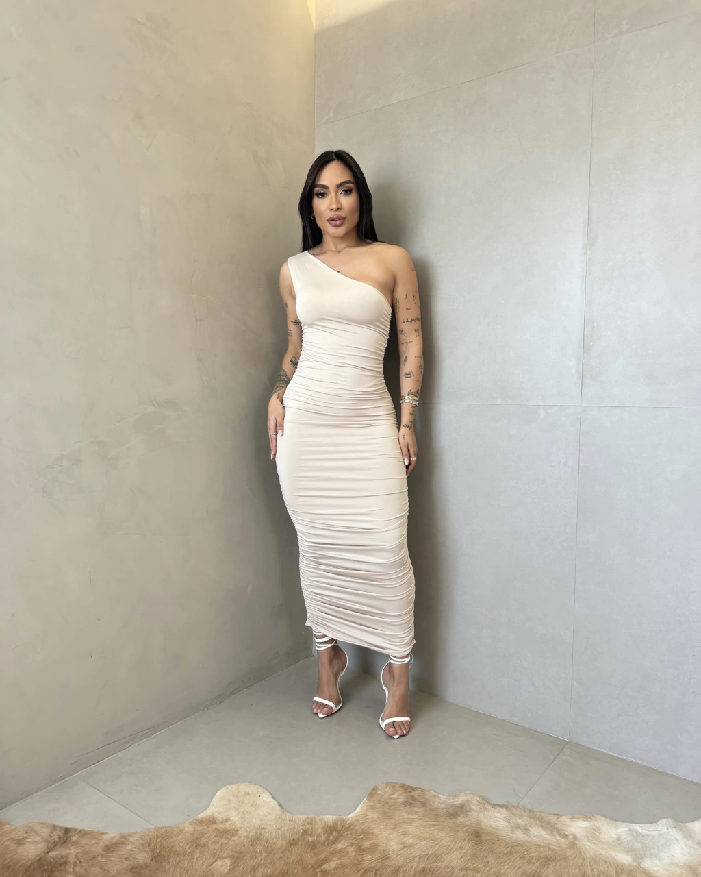 Vestido Midi Inteiro Drapeado - Detalhe de Nula Manga